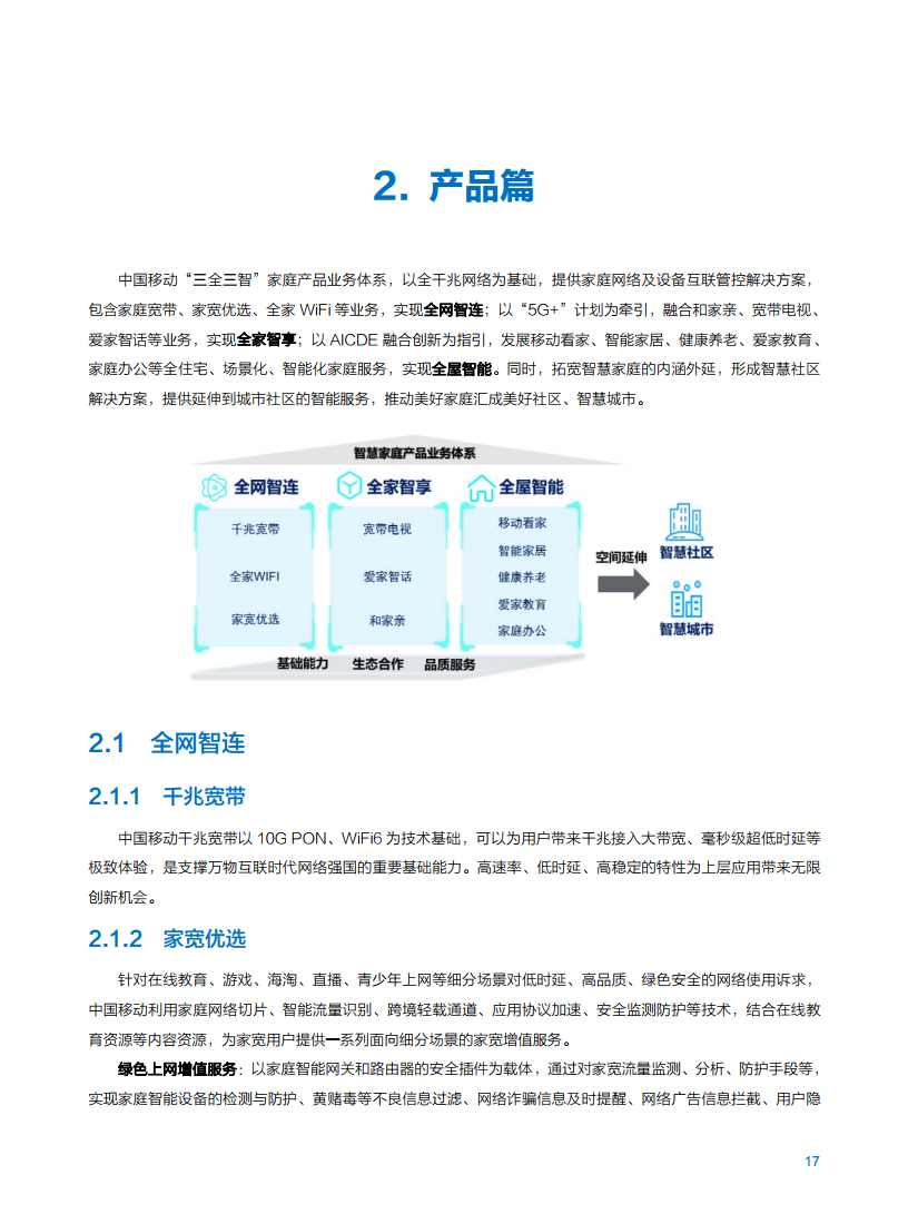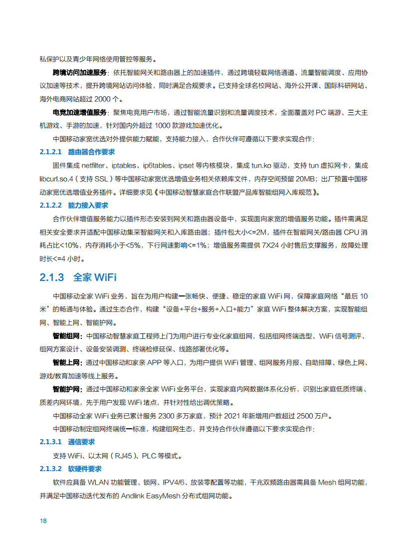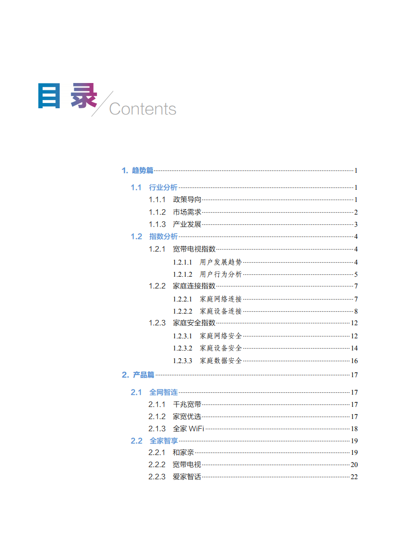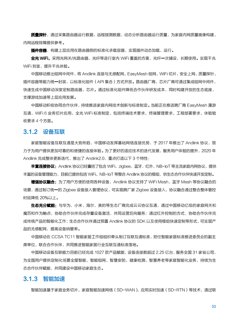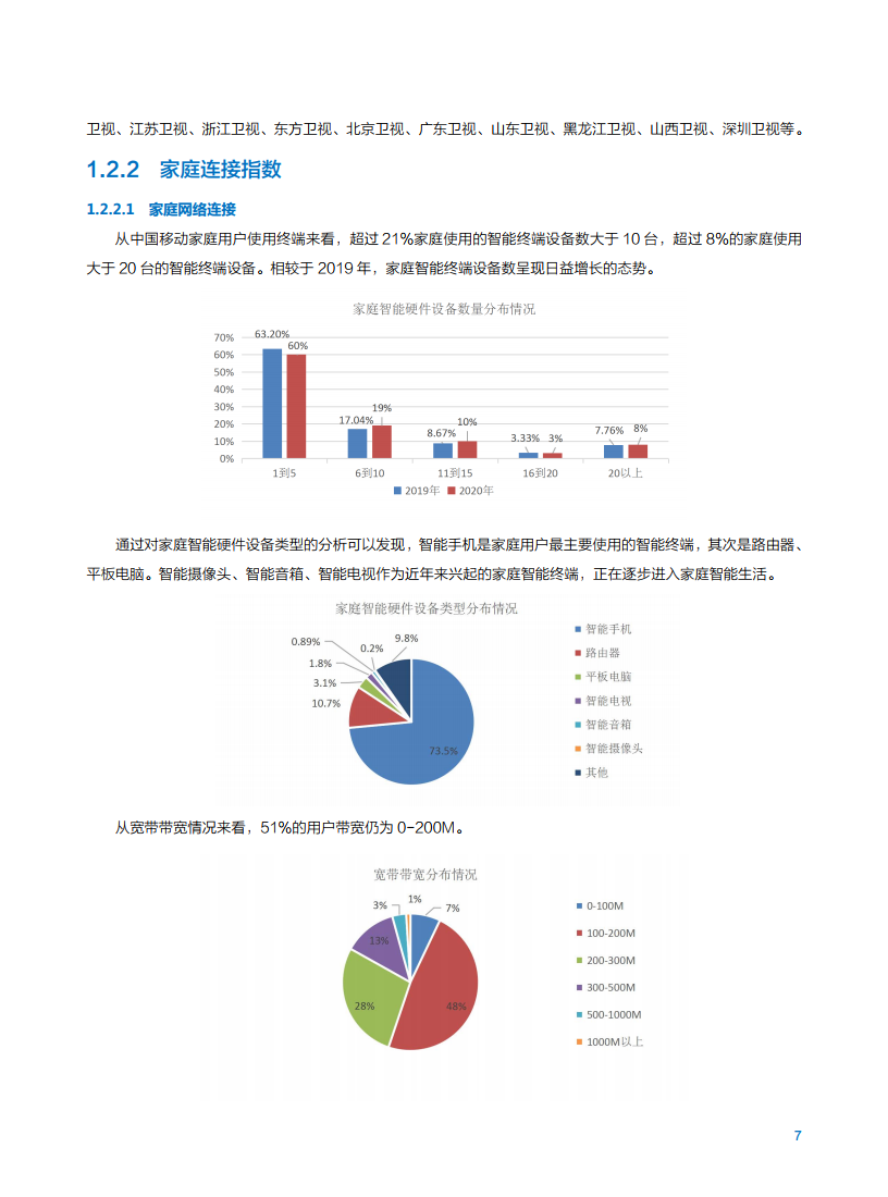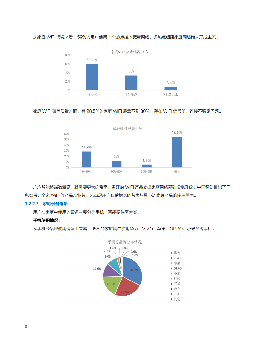 家庭智能终端呈现多元化,21%家庭拥有终端数量超10台,主要为智能手机、路由器、平板电脑。高带宽网络成为未来趋势,WiFi覆盖弱为主要问题,千兆组网具备较大发展空间。