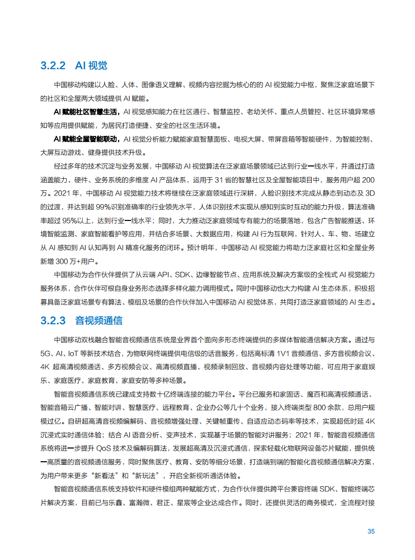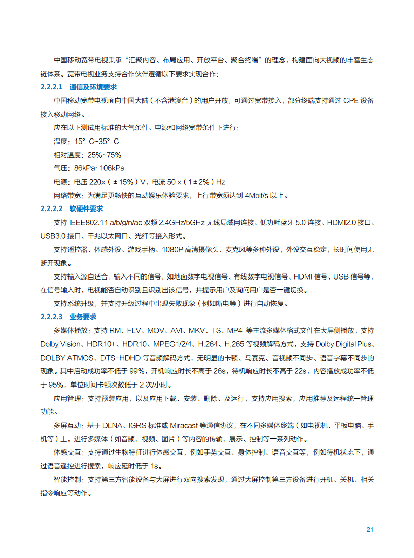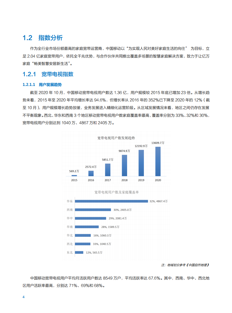 中国移动发布《中国移动智慧家庭白皮书》2021版。该白皮书显示,截至今年10月,中国移动宽带电视用户数达1.36亿(工信部数据,全国IPTV用户数达3.12亿),平均月活用户达到8549万户,平均活跃率达67.6%。不同区域用户呈现差异化,电视剧、电影、少儿等内容最受喜爱。
