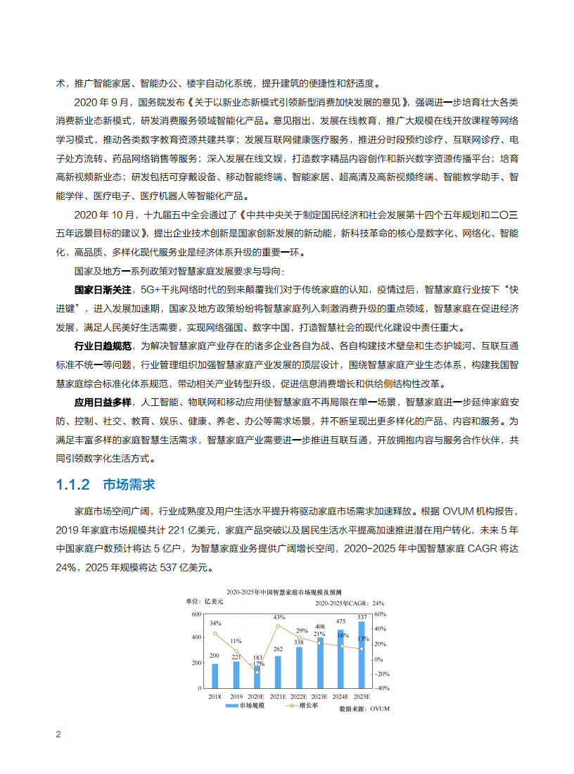 根据OVUM 机构报告,2019年家庭市场规模共计221亿美元,家庭产品突破以及居民生活水平提高加速推进潜在用户转化,未来5年中国家庭户数预计将达5亿户,为智慧家庭业务提供广阔增长空间,2020-2025年中国智慧家庭CAGR将达24%,2025年规模将达537亿美元。