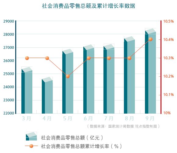 随着宏观经济利好发展,居民消费意愿正不断提高。根据国家统计局数据显示,前三季度社会消费品零售总额累计达238482亿元,同比名义增长10.4%(扣除价格因素实际增长9.8%),增速比上半年加快0.1个百分点,并呈现出平稳上升的良好趋势。