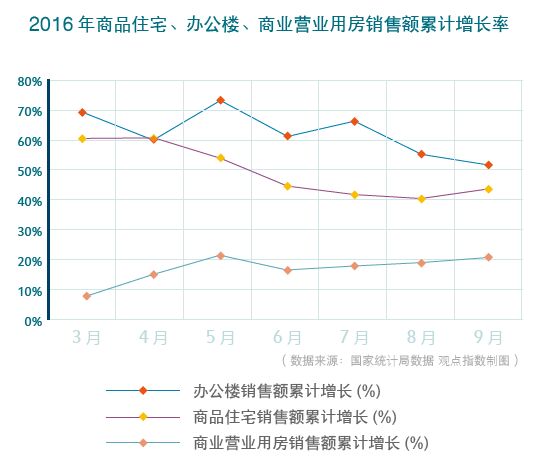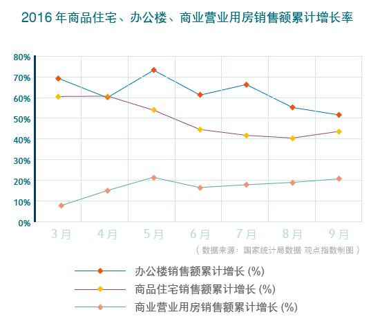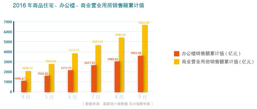 数据显示,2016年商业营业用房销售增长率呈稳步上升趋势,而办公楼销售增速虽有所下降,但从3月份开始已经超过商品住宅销售额。由此可见,商业地产市场销售回暖,有上升空间。