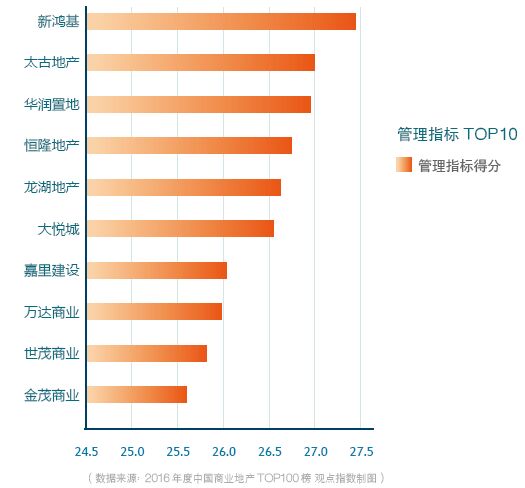 2016年度中国商业地产TOP100榜单中,管理指标体系得分中排名前十的企业基本都超过25分,在其商业产品的管理及运营上各有特色,相互之间的分值差距也微乎其微。
