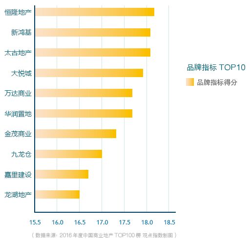 品牌企业能够充分地发挥优势,调整价格策略,提升盈利空间,创造经营效益。品牌同时也具有巨大的社会价值,传递的企业文化和理念成就了企业的核心竞争力,品牌的外溢带来区域价值的提升。优秀商业地产项目,可以进一步提升城市品牌和城市形象,对城市的发展产生了深远的影响。2016年度中国商业地产TOP100品牌指标体系得分前十的企业,平均得分超过15分,而这也是好的品牌带给这些企业的长处和优势。