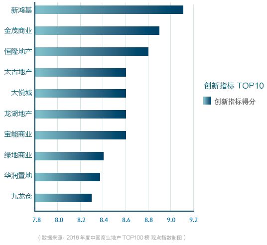 2016年度中国商业地产TOP100创新指标体系中,前十名的企业分数都十分接近,除了第1名新鸿基地产得分为9分以上,其余九名都为8分以上。这些企业都有其优异的商业创新表现,无论是产品的独特性、革新的生产方式,还是资本运作等,都有着自己独特的经验和模式。