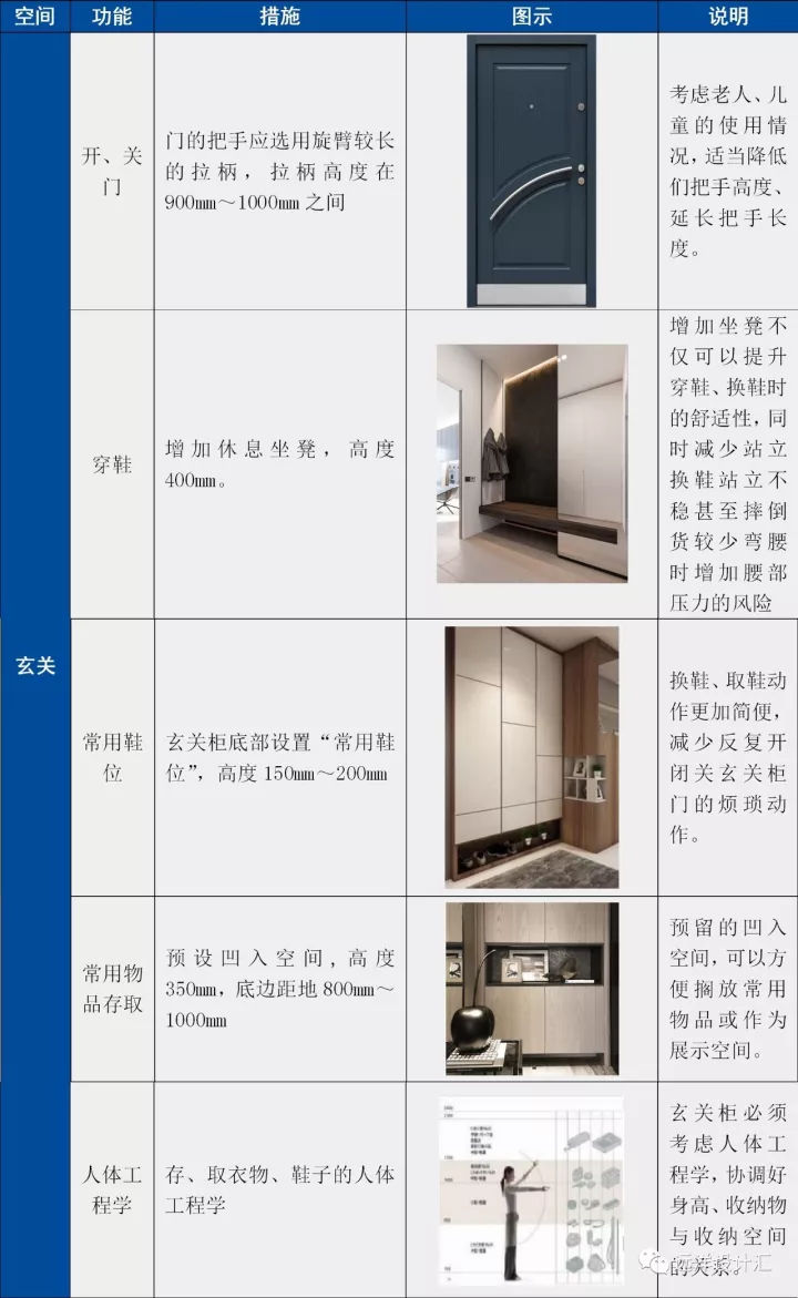 身体的舒适性是健康的空间带给我们最直接的体验和感受。现代居所的室内空间属性要适应新的社会发展、特别是以家庭为单位的人口结构变化带来的改变,同时必须重视住宅的全生命周期设计。全生命周期设计就是要考虑空间的弹性化设计以及对老人、儿童的更多关注和呵护。那么对身体舒适度的敏感程度方面老人和孩子会相对较为强烈,因此这是我们在空间设计和规划中式特别要考虑的。下面以玄关、卫生间为例说明: