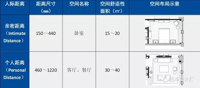 人类学教授霍尔博士将交往中的距离领域划分为四种类型:亲密距离、私人距离、社交距离和公共距离。由于居室空间尺度较小,一般只涉及前两种人际距离,即亲密距离和个人距离。