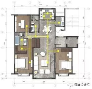 居住动线就是家庭成员日常移动的路线,主要涉及客厅、书房、卧室、卫生间等,要尽量便利、私密。居住动线主要原则是动、静分区。在保证基本合理的分区的基础上,才能谈到使用者的空间中的舒适性,试想如果动区与静区,互相穿越,毫无秩序,这将给房间使用者带来极大的不便,尤其是对家庭成员的不同行为带来的干扰与被干扰现象将长期困扰家庭成员。