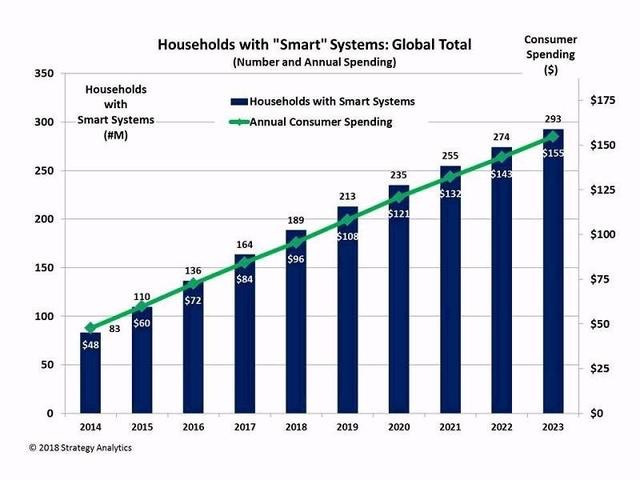 427 2019年,智能家居将迎来最好的发展年份,伴随5G和AI等技术发展,智能家居等智能硬件市场规模在未来几年将得到迅猛发展,此前Strategy Analytics数据显示,2018年智能家居市场规模将达960亿美元,到2023年增增长至1550亿美元,这一场规模将超万亿人民币,巨大蛋糕引发各大科技企业纷纷涉足,希望能分得一杯羹。