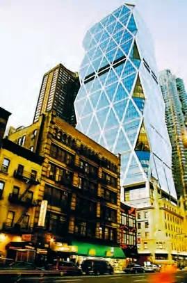 LEED认证系统包含众多以提升健康为目的的规定条文。图为由英国福斯特建筑事务所(Foster and Partners)与加拿大亚当森建筑事务所(Adamson Associates)联合设计的赫斯特大厦(the Hearst Tower),获得了LEED黄金级认证。建筑中无不体现着活力与绿色设计的特征,如自行车停放空间的设计等。